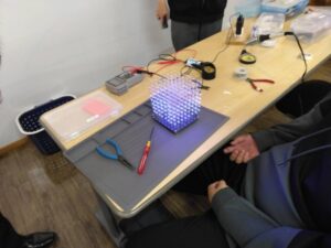 LEDキューブの最後の組み上げ。あと少し、見ているこちらがワクワクします。