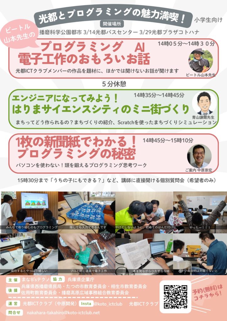 しかも、Scratchを組合せたお話だそうです。Scratchはブロックを組合せてプログラムを作るツールです。まちづくりとどう関係するのか、私も楽しみにしております。